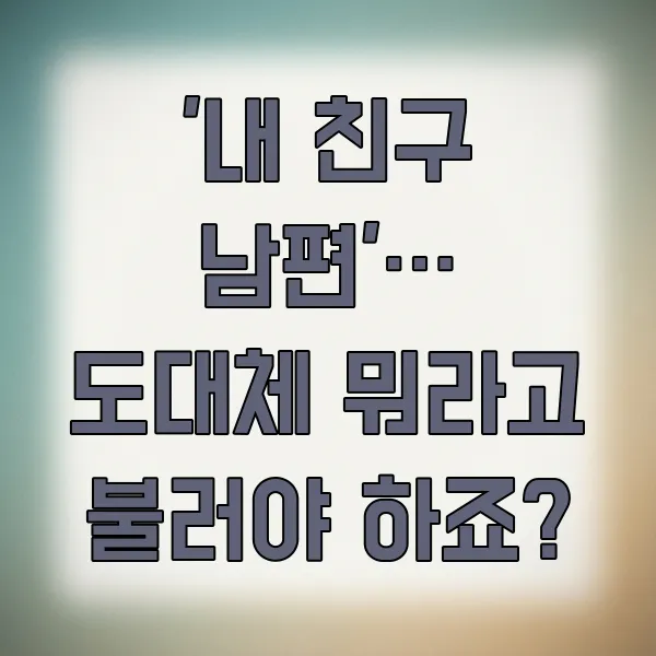 면책 조항: 본 콘텐츠는 친구 남편, 배우자, 가족 간의 일반적인 호칭 및 사회적 관계에 대한 정보를 제공하기 위한 목적으로 작성되었습니다. 특정 상황이나 개인에게 적용되는 호칭은 문화적 배경, 관계의 친밀도, 개인의 선호도에 따라 달라질 수 있으며, 본 정보만을 기준으로 판단하여 발생하는 결과에 대해 제작자는 책임을 지지 않습니다.